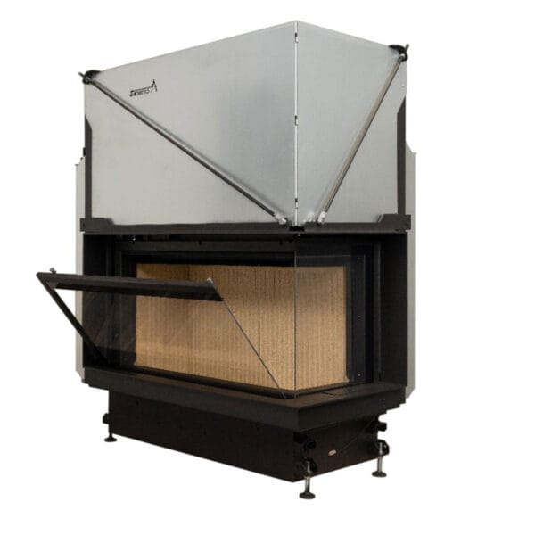 Focar de șemineu – A.caminetti Quattro 90 R Premium Edition – Colț panoramic dreapta (R), 2 suprafețe vitrate, 14.8 KW, randament >80%, încorporabil, Garanție 5 ani.