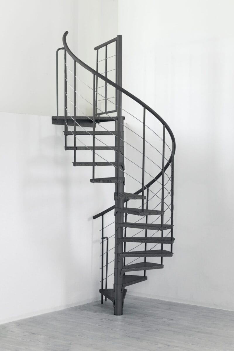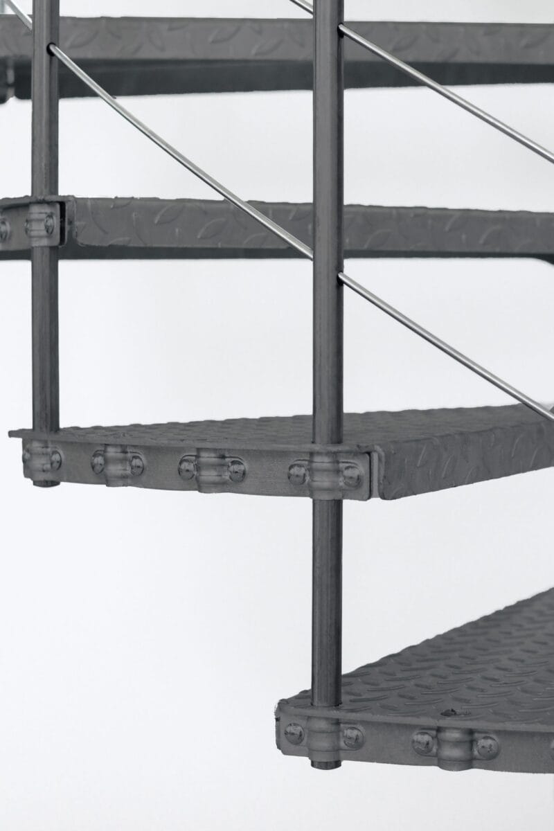 Componentele din oțel ale scării elicoidale Spino Zink Color nu sunt doar galvanizate, ci și vopsite în câmp electrostatic. Ai la dispoziție trei variante de culoare: negru, antracit și alb. Mâna curentă din PVC este disponibilă în culorile asortate, iar barele inferioare ale balustradei sunt realizate din oțel inoxidabil. În funcție de spațiul disponibil în exterior, poți alege diametre de 120, 140, 160 sau 180 cm.