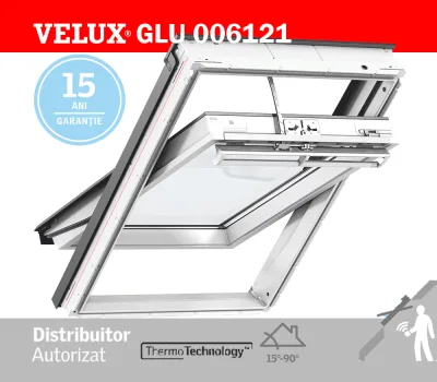 Velux GLU 006121 este o fereastra de mansardă cu acționare electrică și articulare mediană.
